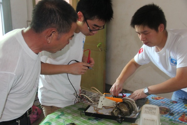上午10:30,一位老爷爷上门约修,志愿者余兆与刘俊江二话不说,提着配件和工具箱就出发了。先后帮助村民维修好了电风扇和洗衣机。修理洗衣机是件不容易的事,首先用螺丝刀将控制面板拆开,随后用万用表测量线路电容,经过一番尝试后最终将问题定在排水开关上。经过一个上午的忙碌,洗衣机的排水问题终于得以解决。为表示感谢,老人一家想邀请吃午饭,却被他们婉言谢绝。“这种情况时有发生,可都被我们谢绝了。”志愿者刘俊江笑着说。回到服务点,吃着其他成员为他们留下的饭菜,两人额外的满足。