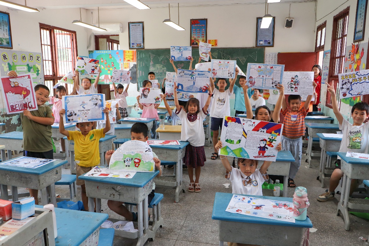 跟随宣讲队一同而至美丽木脚的还有湖南科技大学的大学生们为少年孩童们精心制作的一幅幅奥林匹克体育精神主题手抄报,别出心裁的构图排版、色彩斑斓的拼贴图案、惟妙惟肖的卡通形象、俊秀隽美的文字笔法和天真烂漫的质朴乡娃欢声笑语相映成趣,构成了传遍村舍的天籁妙音、唯美画卷,哥哥姐姐们的画报赠礼助力少年孩童心中奋力拼搏的火炬燃起,象征五大洲各国青年人团结友好、齐聚一堂的运动盛会奥运五环悄悄在少年心中升起。