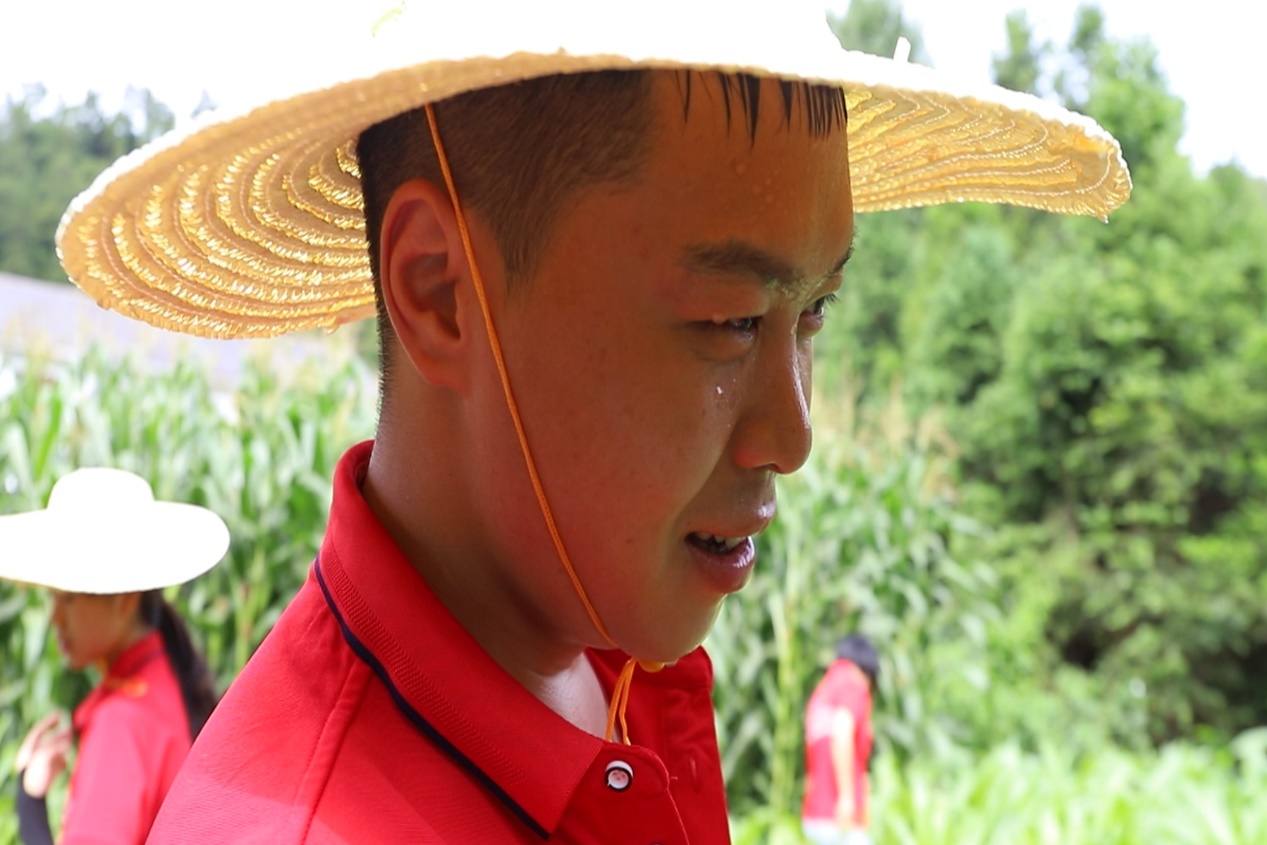 潇湘青年学子头顶烈阳、手持锄头,向尚未成长为高秆玉米的田地内肆意丛生的杂草进行铲叶刨根。铲草动作通过一遍遍的劳动实践,逐渐从生疏变为熟练,铲除的杂草也越堆越高。随后,有丰富经验的当地阿姨指导师生们将铲除的杂草和碎土一起堆肥于苗秆下,以减少水分蒸发、营养物质流失。