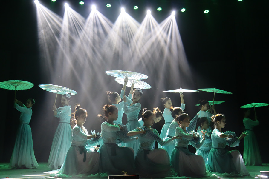 聚光灯洒下,轻柔平和的音乐响起,潇湘学院舞者们手执纸伞,以一席青衣缓缓入场。轻盈灵动的舞姿,绘出一幅动人的江南雨涧春行图。《雨涧春行图》呈现出一幅江南女子在春雨中、山涧里翩翩起舞的灵动画面,整齐有序的舞蹈动作让观众从舞动中看到了万物生长、生机勃勃与充满希望的景象。