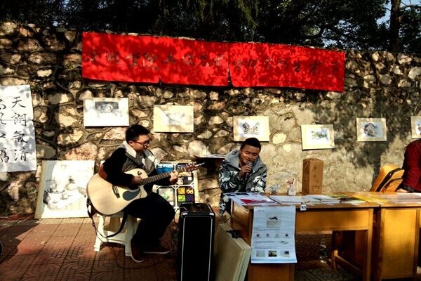 在书画展现场,一改平日只摆放作品的常态,两名男同学的吉他表演让画展文艺气息攀升。顿时吸引了很多同学的眼球,积极参与投票,为自己喜欢的作品增加人气。观展现场气氛活跃,同学反响热烈。“他们画得很好,很有意境,这次活动非常有意义。”谭老师拿出手机边拍照边说。