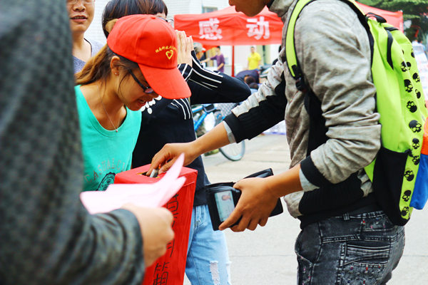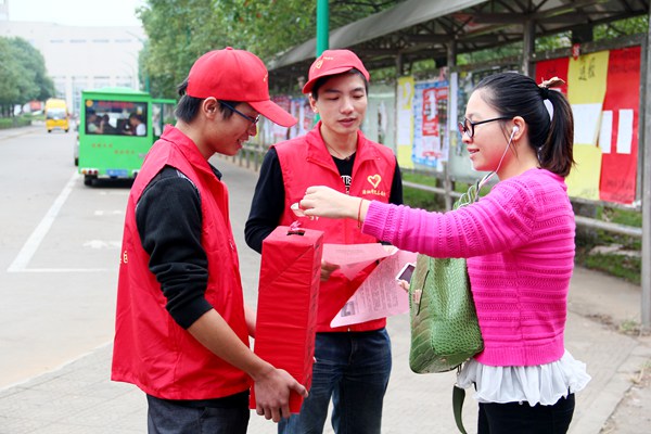 近日,金年官网11级通信一班蔡道鹏同学身患骨癌亟待救治的消息在我校微博、微信、QQ空间等自媒体平台上快速传播。为帮助“小菜刀”度过难关,9月16日清晨,金年官网团委学生会、青年志愿服务队于南校美食广场、北校八区食堂前坪、北校电信路口举行了以“携手道鹏,情满潇湘”为主题献爱心募捐活动。