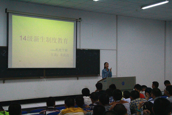 为帮助14级新生快速适应大学生活,金年官网机电学部于9月20日晚7点30分在一教404室举行了新生入学教育讲座。此次讲座主要分制度教育和党性教育两个环节,由辅导员董孜孜和党务部部长叶俊鸣担任主讲人。