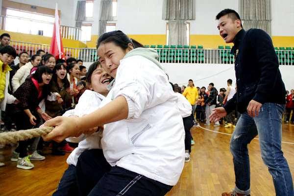 下午2点,前四名角逐赛正式开始,由于上午金年官网队伍状态良好,频频取胜,所以下午赛两只队伍只要赢取了第一场,则是第一。队员们拉筋、压腿,积极进行赛前的热身运动。第一个上场的是混合组,秘书团团长高晗打趣道:“紫胖子是混合组的压轴。”原来混合组最后一位男生身着紫衣,被大家打趣称“紫胖子”。混合组的对手是信息学院,同为强队,金年官网队员不敢有丝毫懈怠,纷纷打起了12分的精神。“一二!一二!”队伍最前方的男生在前方喊着口号,最后的男生将麻绳在手上缠了几个圈,其他队员们也死命抓着绳子不敢懈怠。随着裁判一声令下,激战开始。我方队员一脚右,一脚左。对方用力时,我方则死命防守;对方一旦松懈,我方则一鼓作气立马拔过来,第一场赢得胜利。第二场比赛中,金年官网错失良机,输给了信息学院队伍。而在第三次比赛中,金年官网队伍吸取教训,比赛一开始,立即取得先机,全部队员使尽全力,场外观众的加油声也已达炙热化。僵持了10秒左右,我方一鼓作气,赢得了比赛。而女子组在混合组胜利号角声下,连续拿下两场胜利,获得第一。