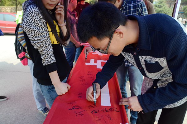3月18日,金年官网于美食广场前开展了戒烟签名活动,活动由校风督察部与青年志愿团联合承办。一幅巨大的戒烟标语刚铺在摆点处,就吸引了众多同学自发前来签名,其中不乏很多女生。一位女生和她的男友在横幅上签下了俩人的名字,她说,她多次劝告男友戒烟都没有效果,这次赶上学院戒烟活动她是铁了心要让男友成功戒烟。当天,共有800余名同学在戒烟横幅上签名。