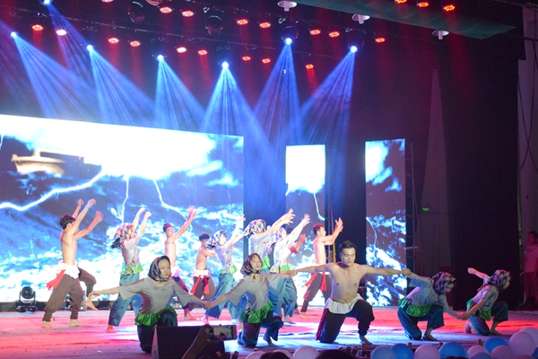 站在黄河之上,感受如黄河般气势磅礴的民族舞《奋进》,该舞极富民族特色,以波涛汹涌的大海为背景,以抑扬顿挫的鼓点为音乐,男舞者赤裸上身,女舞者矫健灵动,时而分散,时而集合,舞姿沉稳极富力量感,演绎出了水手在面对风暴时团结奋进的精神气概。